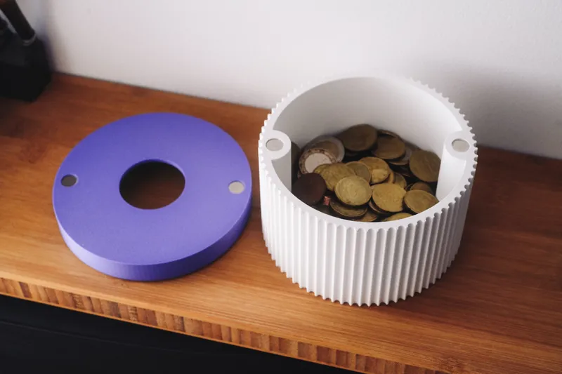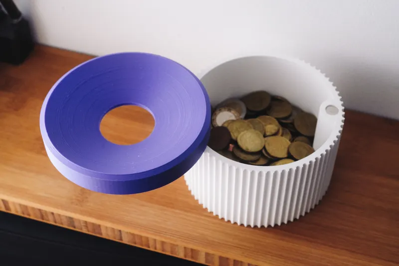 The lid shape and swiveling mechanism are heavily inspired by a product called the Revov Coin Storage, with some improvements like the lid slope angle being more 3d printing friendly and the magnetic connection happening on both sides enabling the lid to swivel in any direction.