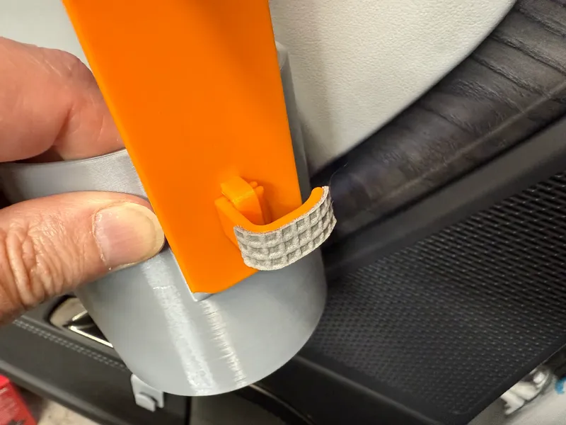Rob@OpenSourceEV contributed a custom clip that attaches to the edge of the storage area under the rear seat of an R1T. You can find his original model, which is what he sells, in the Clips + Adapters folder. I've also remixed his model to try to match the look and feel of the rest of my clips. I extended the attachment point by 12mm to allow the seat to be lifted all the way and not put pressure on a cup, if still attached. You can find my version along with all of the other clips.