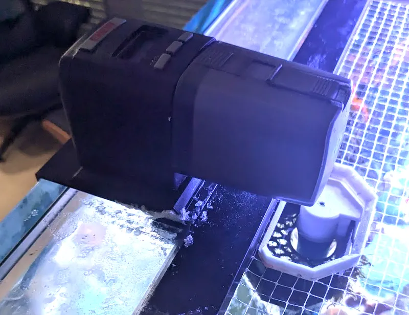 Autofeeder mount for the Eheim aquarium autofeeder that fits Innovative Marine euro-braced tanks. One piece print in place with mesh at the bottom, no supports needed.