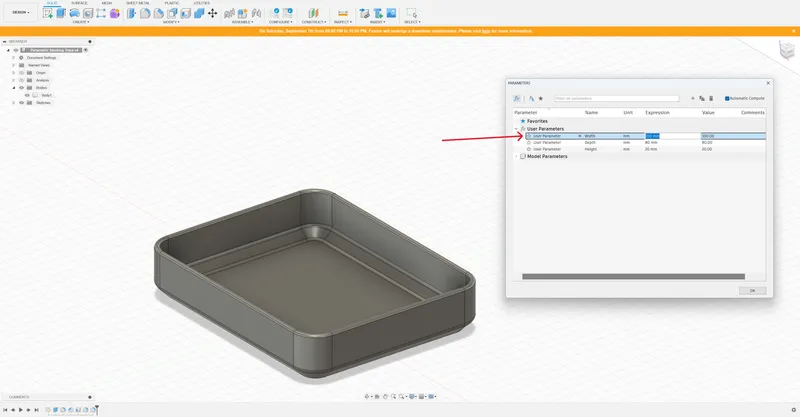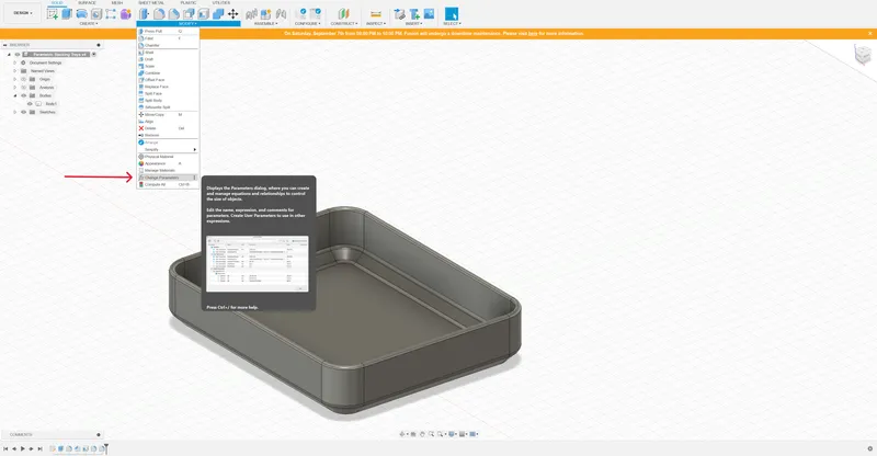 To customize the size of a tray to your liking, download the f3d file and open Fusion 360. Navigate to Modify→Change Parameters.